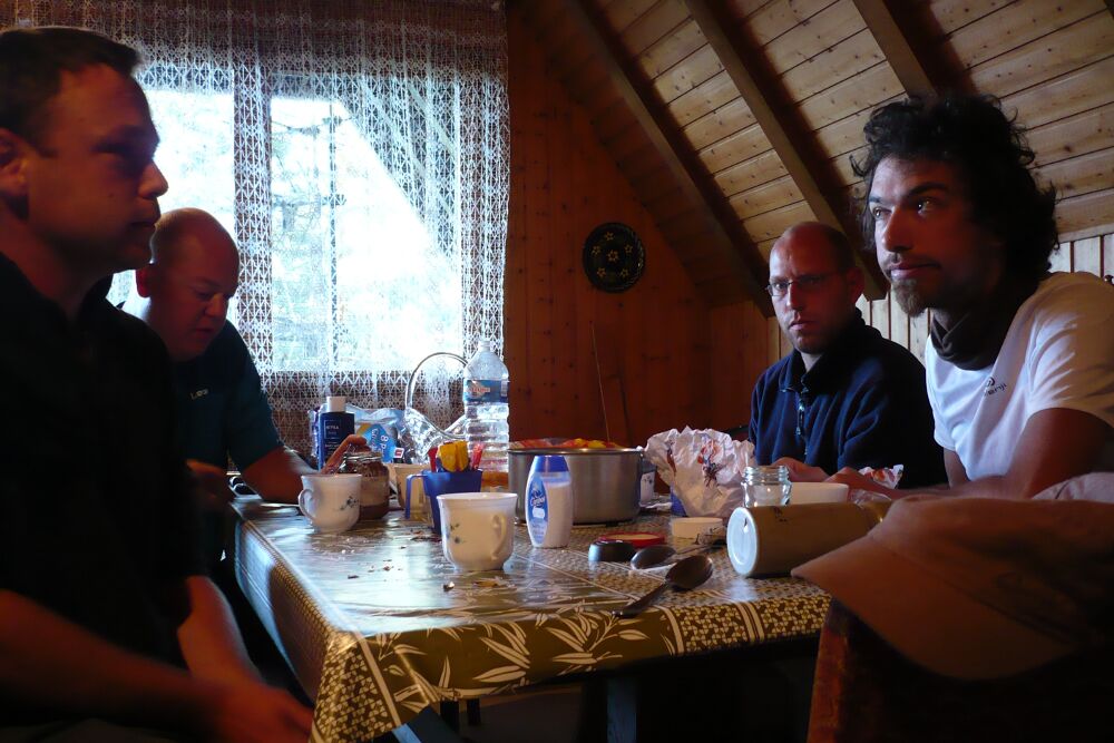 Petit déj' au chalet, on est pas tous en forme, on a cassé le rythme avec la journée cool d'hier.