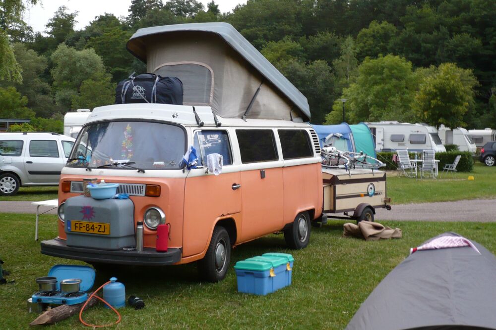 Au camping de Villey-le-Sec, le long de la Moselle, un bon vieux combi-camper VW hollandais.