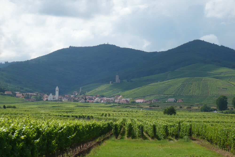Vignobles, massifs et petit village alsacien (Riquewihr).