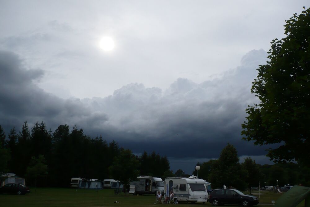 Au camping, tente montée, Fab estime le déluge à 6 minutes : correct!
